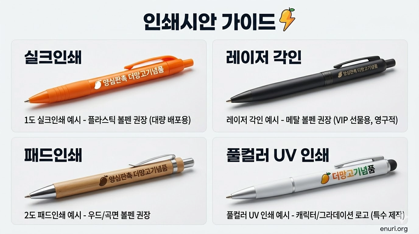 고민하지 마세요. **양심판촉 더망고(enuri.org)**는 수만 건의 납품 데이터를 바탕으로 제품 재질에 딱 맞는 **'최적의 인쇄 시안'**을 무료로 잡아드립니다.