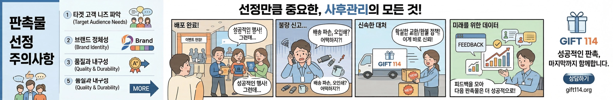 납품 이후 제품 하자, 인쇄 오류, 수량 부족 등 문제가 발생할 수 있으므로, 사후 관리(A/S) 체계가 잘 갖추어진 업체를 선택하는 것이 중요합니다. 긴급 상황에도 신속히 대응할 수 있는 직통 상담 채널, 견고한 사후 서비스 정책이 있는지 반드시 확인해야 합니다[1].