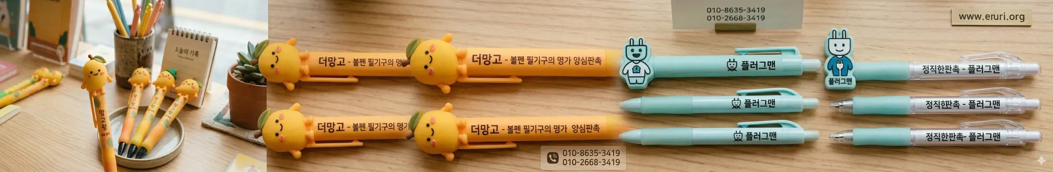 "캐릭터 볼펜은 디자인만큼이나 인쇄의 견고함과 필기감이 중요합니다. 예쁜 쓰레기가 되지 않도록, 더망고와 플러그맨기프트는 검증된 리필심과 인쇄 공법만을 사용합니다."