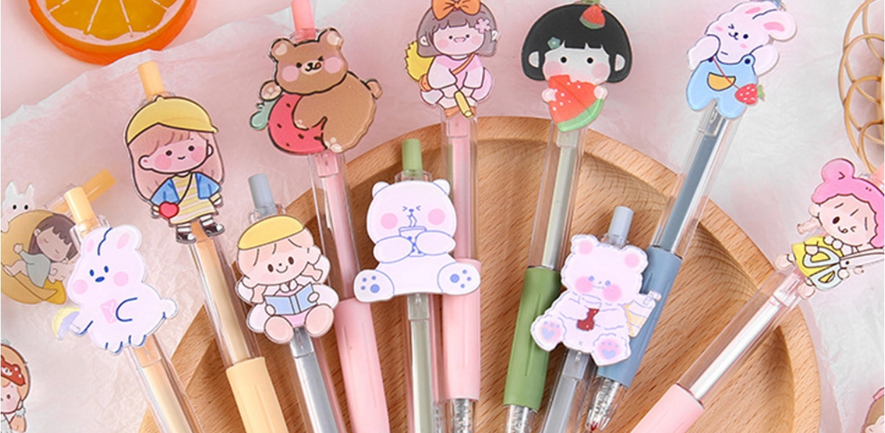 캐릭터 모양으로 커팅된 아크릴 판을 볼펜 클립이나 상단에 부착하는 방식입니다.