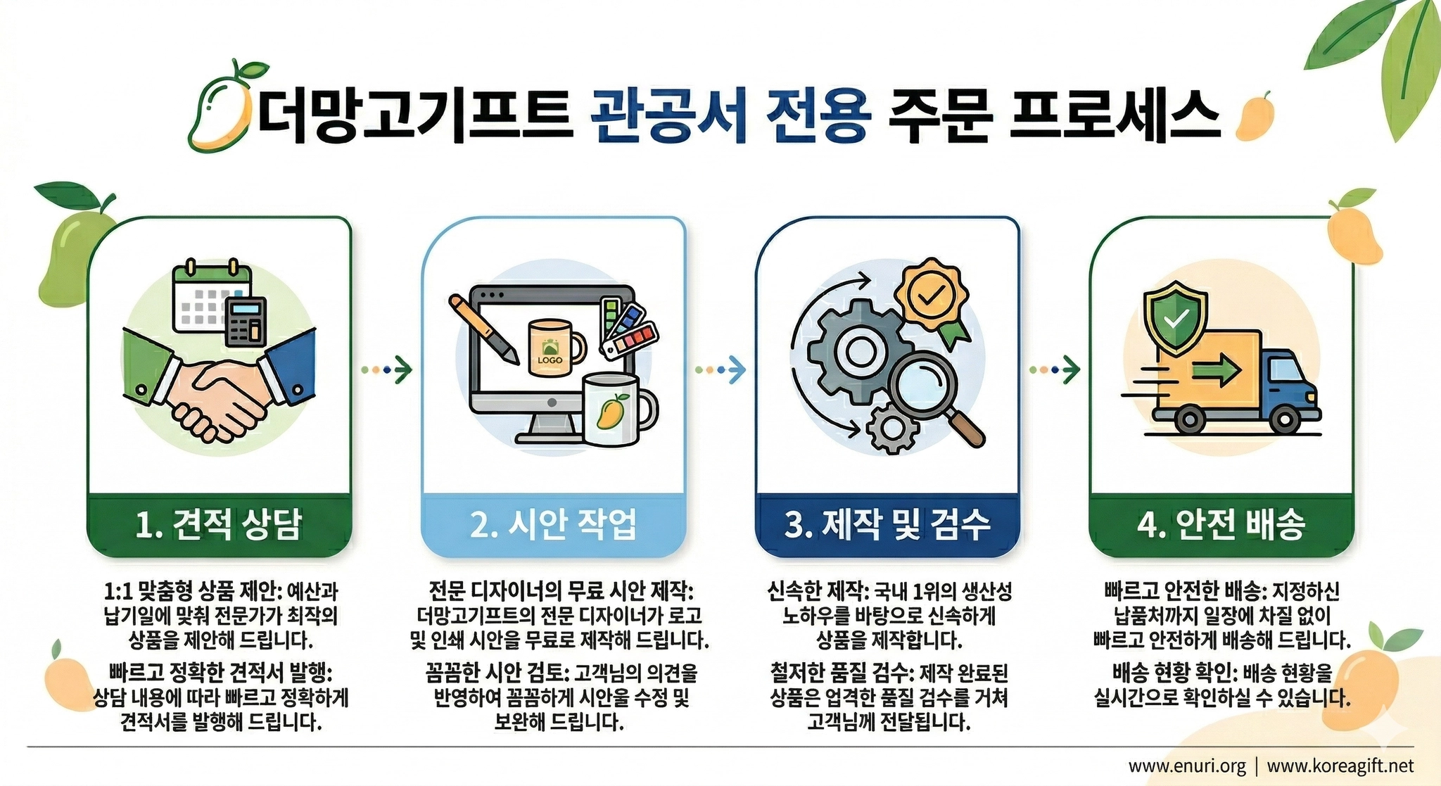더망고기프트는 관공서 및 공공기관 고객님의 특성을 깊이 이해하고, 이에 최적화된 전문적인 전용 주문 프로세스를 운영하고 있습니다. 믿고 맡길 수 있는 더망고기프트의 체계적인 프로세스를 상세히 안내해 드립니다.