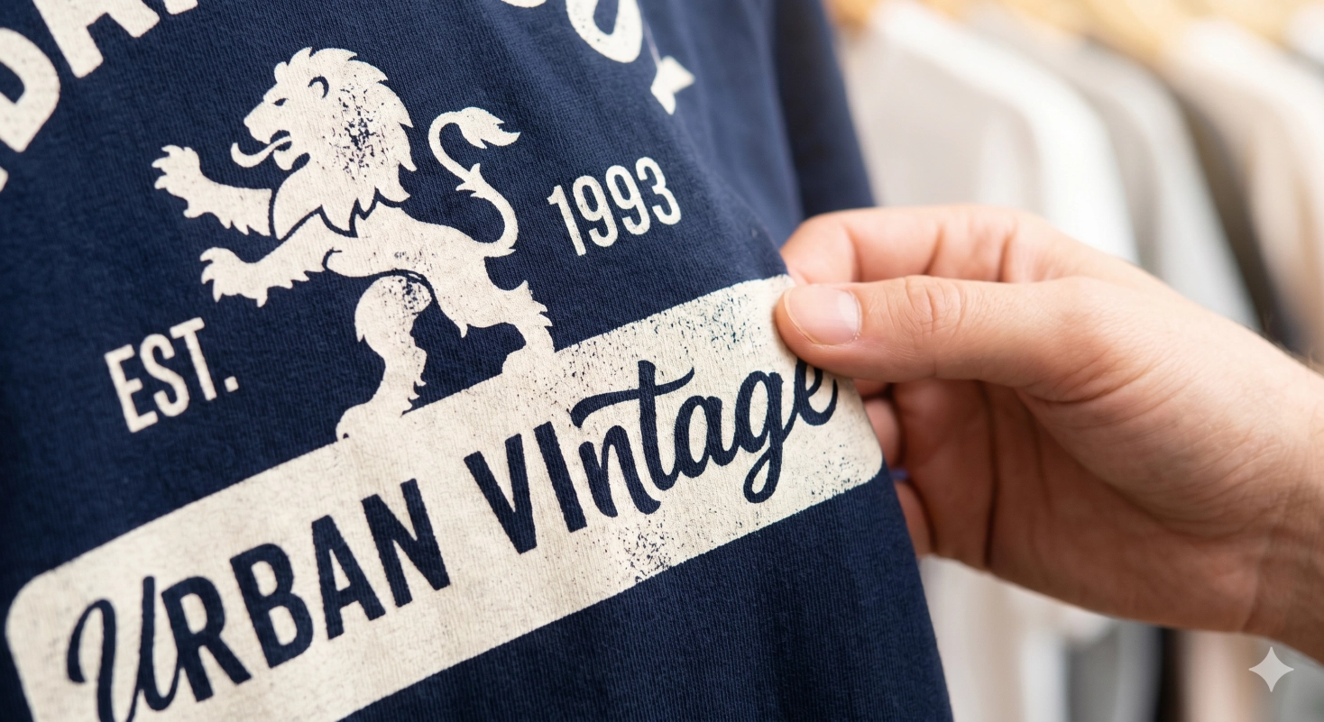 발염 인쇄가 적용된 네이비색 면 티셔츠의 클로즈업 샷입니다. 원단의 어두운 색을 빼내어 자연스럽고 부드러운 오프화이트/크림색으로 표현된 "URBAN VINTAGE" 디자인을 볼 수 있습니다. 손가락으로 인쇄 부위를 만지는 모습을 통해, 일반 나염과 달리 인쇄 면이 딱딱하지 않고 원단 자체처럼 부드럽다는 점을 강조