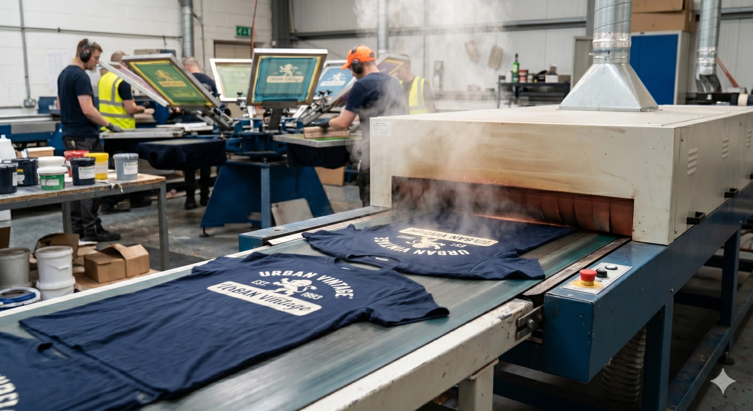 건조기에 들어갈 때는 발염제가 인쇄된 어두운 상태이지만, 열을 받으면서 디자인 부위의 색이 빠져나가 밝고 빈티지한 크림색으로 변하는 역동적인 과정을 보여줍니다. 열처리 과정에서 발생하는 수증기와 작업장의 활기찬 분위기가 담겨 있습니다.