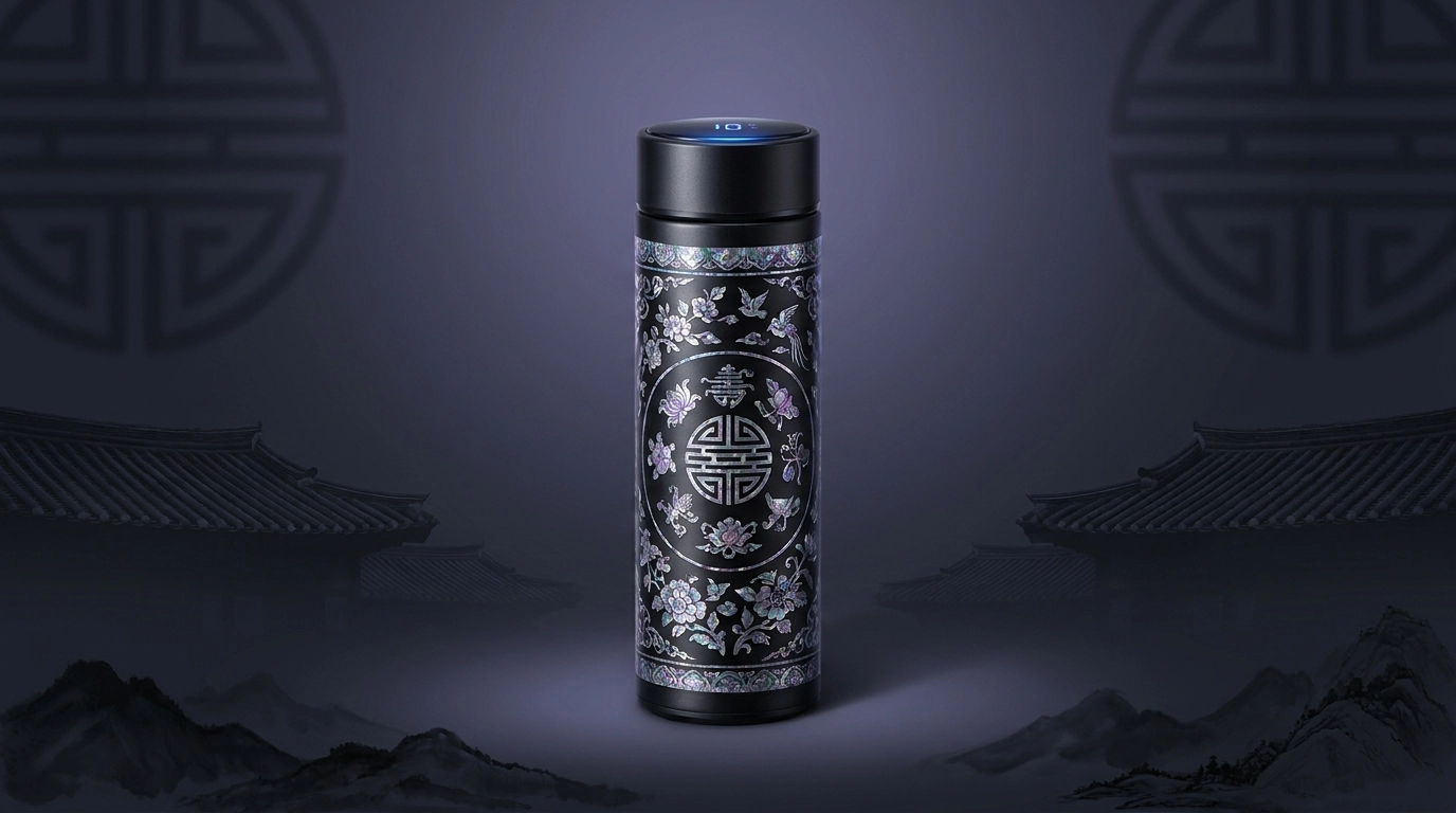 "전통과 기술의 만남, 나전칠기풍 리얼 316 온도텀블러입니다. 한국의 아름다운 문양에 스마트한 온도 표시 기능을 더해, 외국인 바이어 선물이나 관공서 VIP 기념품으로 최상의 가치를 전달합니다.”