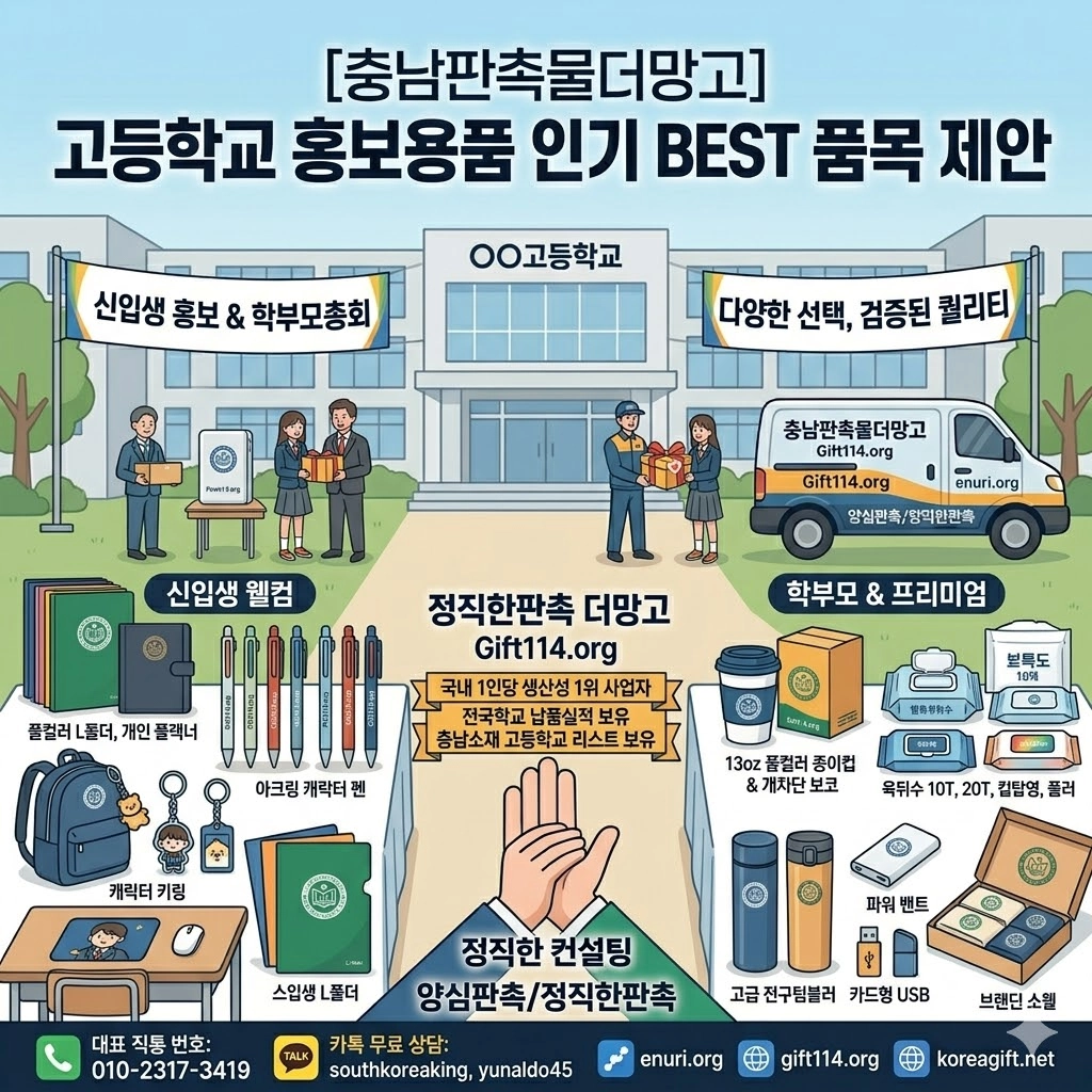 #충남고등학교리스트 #천안고등학교 #아산고등학교 #공주고등학교 #서산고등학교 #논산고등학교 #당진고등학교 #학교판촉물 #학교기념품 #신입생홍보물 #학부모총회선물 #학교굿즈제작 #충남판촉물더망고 #양심판촉 #정직한판촉 #공공기관우선구매 #기프트114 #enuri #전국학교납품 #학교행사용품 #대량구매기념품 #캐릭터볼펜 #아크릴키링제작 #풀컬러종이컵 #물티슈제작 #각티슈주문제작 #충남교육청 #입학설명회기념품 #학교마스코트굿즈